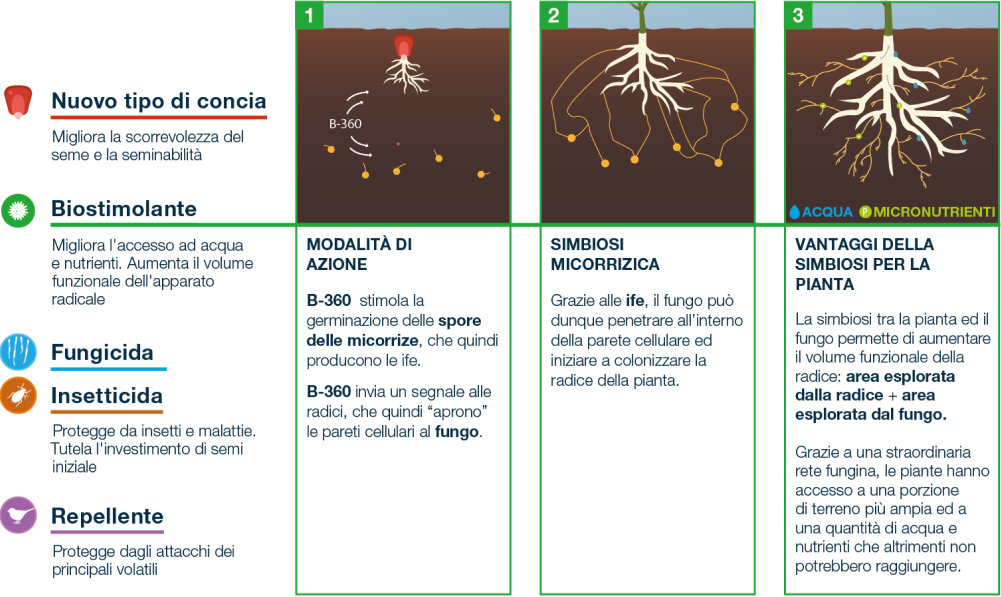 È qui che entra in gioco la tecnologia Acceleron® applicata al seme: protegge l'investimento di semina dalle minacce, mentre i biostimolanti promuovono lo sviluppo di un volume funzionale radicale più ampio, migliorando l'assorbimento di acqua e nutrienti della pianta attraverso la simbiosi con funghi micorrizici.