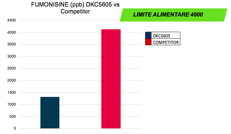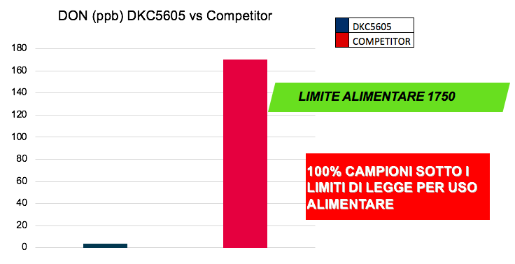Per verificare gli aspetti qualitativi, DKC5605 è stato comparato al principale competitor pari classe del mercato per verificare il contenuto di Fumonisine e Deossinivalenolo (DON).