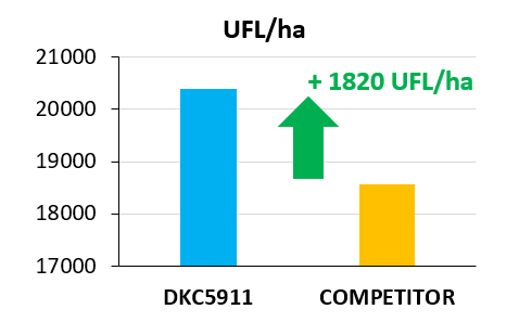 Figura 3. UFL prodotte per ettaro da DKC5911 e dal competitor. N° confronti 6 (MD), anno 2022.