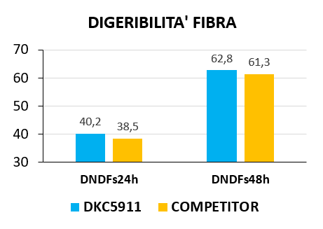 La qualità della fibra di DKC5911 esprime tutto il suo valore sulla digeribilità (Grafico 2). A 24h la digeribilità si colloca a circa due punti sopra il competitor analizzato, questo dato risulta importante in stalla perché favorisce un più rapido svuotamento del rumine garantendo una più alta resa energetica.