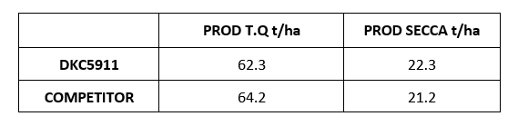 Tabella 3. Produzione tal quale e sul secco di DKC5911 e dal competitor. N° confronti 6 (MD), anno 2022.