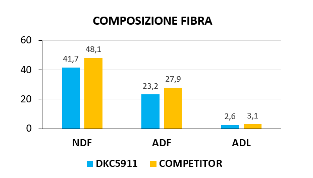 Figura 1. Contenuto di NDF, ADF e ADL (% sulla sostanza secca) di DKC5911 e del competitor. N° confronti 6 (MD), anno 2022.