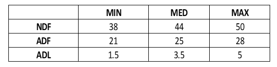 Tabella 1. Valori minimi, massimi e medi di riferimento per NDF, ADF e ADL indicati da ARAL (Associazione Regionale Allevatori Lombardia)
