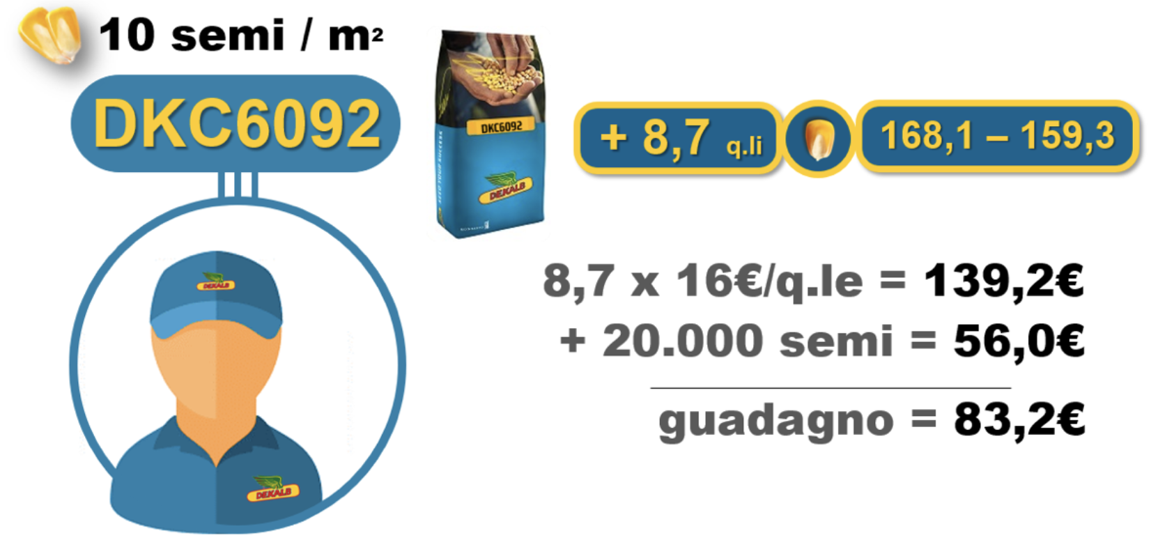 Negli ambienti ad alta fertilità * seminare DKC6092 a 10 semi/m2 rispetto ad una semina a 8 semi/m2 permette di aumentare le rese di 8,7 quintali all’ettaro**. Nonostante il maggior esporso di seme, il vantaggio è di poco meno di 85 €/ha.