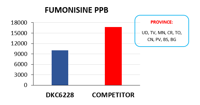 Tra le micotossine più diffuse nel mais troviamo le fumonisine: queste micotossine sono metaboliti secondari di alcuni funghi del genere Fusarium che impensieriscono soprattutto gli allevatori di vacche da latte. Dai dati derivati dall’attività di monitoraggio 2022, che comprende rilievi effettuati anche nelle provincie più a rischio, DKC6228 risulta essere ben al di sotto del limite legislativo per uso zootecnico di 60.000 ppb e decisamente inferiore rispetto al competitor (Figura 2).
