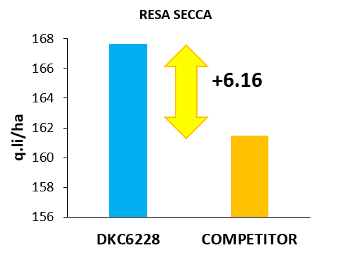 In due anni di dati DKC6228 esce vincente in modo netto dal confronto con il competitor numero 1 in termini di resa, con un differenziale di 6.16 q.li/ha (Figura 1).