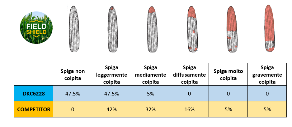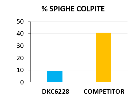 Analizzando i dati presenti nella Figura 5 si può osservare come DKC6228 presenti le più alte percentuali di casi riportanti un attacco di gravità ridotta. Già i casi di spiga mediamente colpita danno ragione a DKC6228 con uno scarto del 27% rispetto all’ibrido a confronto. Nelle situazioni di spiga maggiormente colpita il differenziale tra DKC6228 e il competitor si evidenzia in maniera significativa (0 spighe colpite). La capacità di DKC6228 di tollerare stress biotici ed abiotici specifici delle diverse aree geografiche del nord Italia, garantendo produzioni elevate, ci permette dunque di inserirlo nel programma FIELD SHIELD. Nel caso specifico, DKC6228 viene consigliato nelle aree caratterizzate da una elevata pressione del genere Fusarium (compreso Fusarium graminearum).