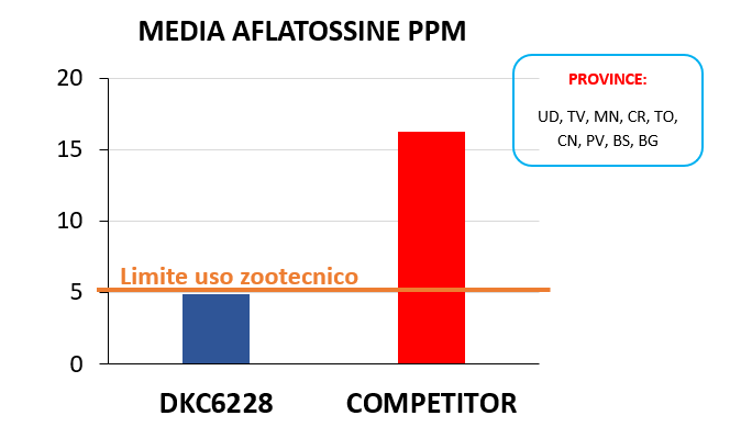 Tra le micotossine più diffuse nel mais troviamo le fumonisine: queste micotossine sono metaboliti secondari di alcuni funghi del genere Fusarium che impensieriscono soprattutto gli allevatori di vacche da latte. Dai dati derivati dall’attività di monitoraggio 2022, che comprende rilievi effettuati anche nelle provincie più a rischio, DKC6228 risulta essere ben al di sotto del limite legislativo per uso zootecnico di 60.000 ppb e decisamente inferiore rispetto al competitor (Figura 2).