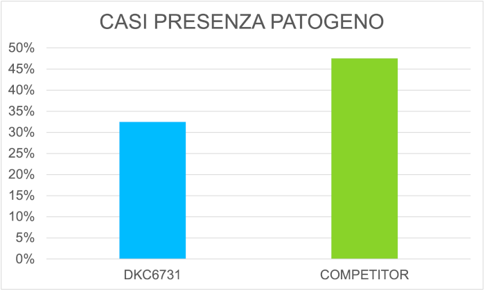 Dai rilievi effettuati dai tecnici Bayer in 42 campi prova tra il 2022 ed il 2023 è emerso come nei confronti del miglior competitor, DKC6731 abbia manifestato minore attacco da parte di funghi del genere Fusarium (Grafico 5) risultando totalmente pulito nel 67% dei campi esaminati.