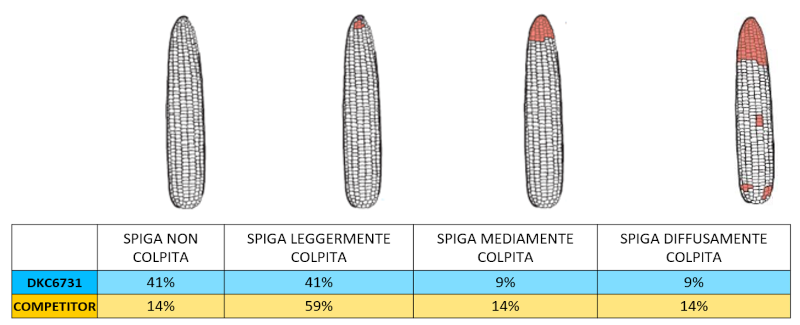 Scendendo nel dettaglio dei 22 campi si nota come DKC6731 sia risultato con spiga non colpita per il 41% dei casi e che anche in caso di spiga mediamente e diffusamente colpita, mantenga un netto distacco rispetto al miglior competitor.