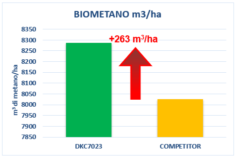 Nel grafico a seguire, ritroviamo ancora una volta il vantaggio di DKC7023 nella produzione di biometano (+263 m3/ha), evidente aumento produttivo dovuto al maggior apporto della frazione energetica altamente digeribile dai batteri dell’impianto.