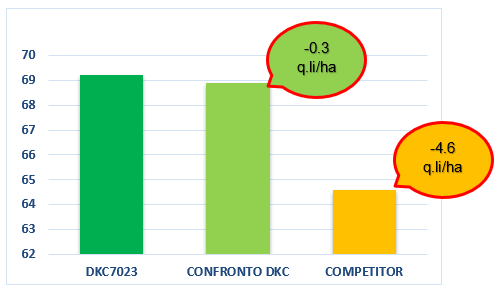 Il grafico riportato in Figura 1 ci fa vedere quale sia il vantaggio in termini qualitativi dell’ibrido DKC7023 rispetto ad un pari Classe Dekalb e rispetto al competitor di pari classe della concorrenza.