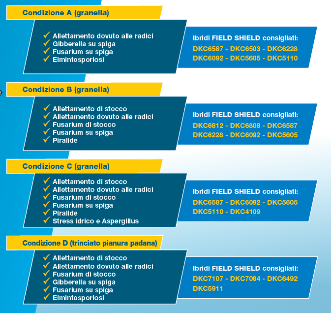 Sono state così identificate quattro condizioni di coltivazione per il mais, caratterizzate da differenti profili di rischio. Nella Condizione A, ad esempio, le problematiche riguardano l'allettamento causato dall'apparato radicale, la presenza di funghi sulla spiga (Gibberella e Fusarium) e sulla foglia (Elmintosporiosi). Gli agricoltori che nei campi hanno prevalenti questi rischi dovrebbero allora puntare su ibridi come DKC6587, DKC6503, DKC6228, DKC6092, DKC5605 oppure DKC5110.